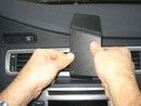 Trykk på den vedlagte spalteåpneren mellom rammen som omgir luftgrillen og dashbordet for å utvide gapet. Press den rillede nedre delen av del 1 inn i spalten ved siden av spalteåpneren. Trykk til du hører/føler at det klikker inn i gapet. Fjern gapåpneren. Trykk på spalteåpneren mellom rammen som omgir luftgitteret og dashbordet. Press forover på den øvre delen av del 1 slik at den rillede kanten går inn i spalten ved siden av spalteåpneren. Trykk vekselvis på høyre/venstre side av del 1 til du hører/føler at den klikker inn i gapet. Fjern gapåpneren.