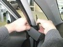 Bruk den medfølgende våtservetten for å rengjøre området der ProClip-braketten skal monteres. Fjern beskyttelsesplasten på den dobbeltsidige klebebåndet på braketten. Trekk ut gummilisten på A-søylen litt for å utvide gapet.