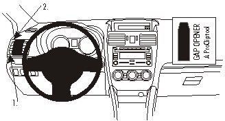 Trykk den medfølgende gapåpneren inn i det nedre spalten mellom luftgitterrammen og instrumentbordet for å utvide gapet. Bruk den medfølgende våtservetten for å rengjøre området der ProClip-braketten skal monteres. Fjern beskyttelsesplasten på den dobbeltsidige klebebåndet på ProClip-braketten. Trykk den buede nedre delen av braketten inn i gapet ved siden av spalteåpneren.