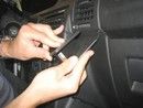 3. Trykk braketten fremover og til venstre slik at den rillede venstre delen går i gapet mellom instrumentbordet og rammen som omgir kontrollpanelet.