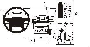 2. Fjern beskyttelsesplasten på den dobbeltsidige klebebåndet på del 1 Trykk del 1 inn i gapet mellom gapåpnerne. Trykk til høyre for del 1, vekk fra rattet, slik at den vinklede delen hekter seg bak / under kontrollpanelet og båndet festes til instrumentbordet. Fjern gapåpneren.