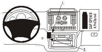 Trykk på den vedlagte spalteåpneren mellom instrumentbordet og midtpanelet for å utvide gapet. Fjern beskyttelsesplasten på de dobbeltsidige limbåndstrimlene på ProClip holderen. acer en holder foran dashbordet.