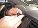 1. Bruk den medfølgende våtservetten for å rengjøre området der ProClip-braketten skal monteres. Trykk på den medfølgende spalteåpneren mellom luftgitteret og den omkringliggende rammen for å utvide spalten. Fjern beskyttelsesplasten på den dobbeltsidige klebebåndet på ProClip-braketten.