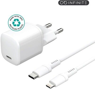 En USB-C vegglader som er laget av resirkulert materiale. Laderens skall er laget av 100 % resirkulert polykarbonat (PC) sertifisert av GRS (Global Recycle Standard).