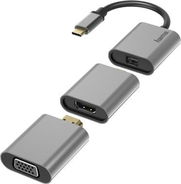 Hama USB-C 6-i-1 videoadaptersett har tre videoadaptere, som sikrer at det er en tilkobling for hver enhet. Brukes til å koble en PC, bærbar PC, Macbook eller nettbrett til en skjerm, TV eller projektor for å overføre digitale lyd-/videodata og sign .