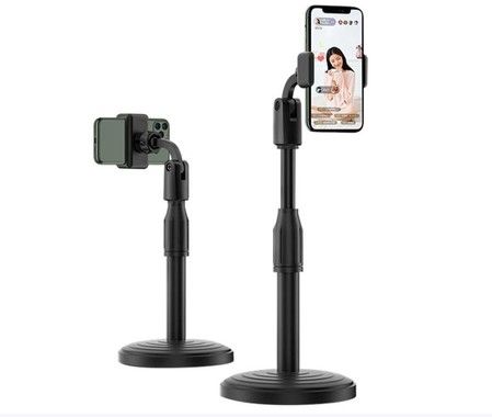 Bordstativ med iPhone feste som kan justeres 360 grader. Høyden kan justeres mellom 28-38 cm. Den vektede basen sørger for at stativet står stabilt.