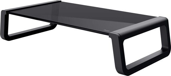 Monitorstativ i herdet glass for en ergonomisk arbeidsstilling og et organisert skrivebord.